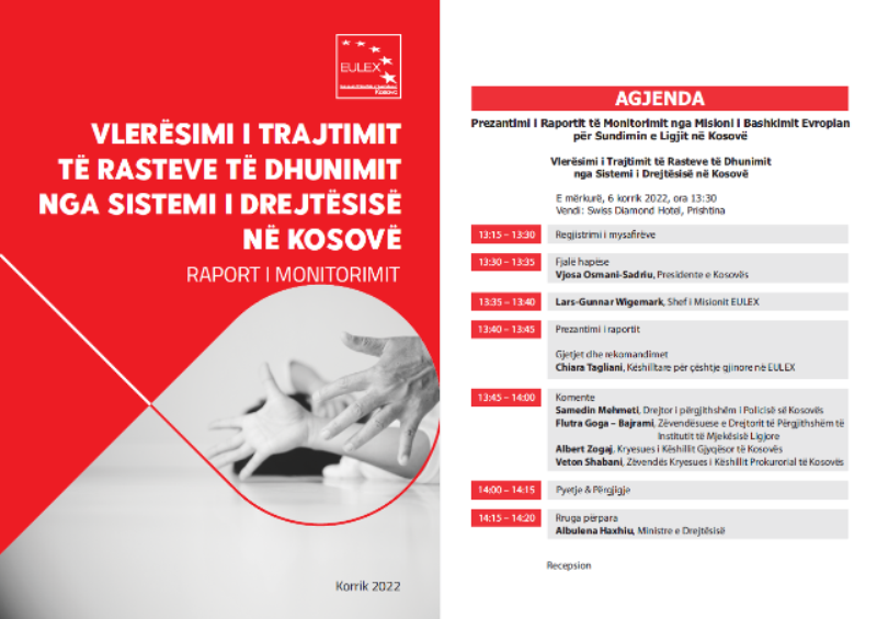 EULEX-i do ta prezantojë Raportin Monitorues të tij “Vlerësimi i trajtimit të rasteve të dhunimit nga sistemi i drejtësisë në Kosovë”, i cili ofron një vlerësim preliminar për mënyrën se si i trajton sistemi i drejtësisë në Kosovë rastet e dhunimit.