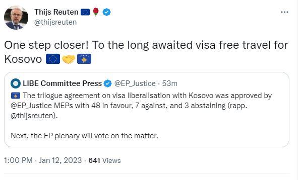 Raportuesi i Parlamentit Evropian për liberalizimin e vizave për Kosovën, eurodeputeti holandez, Thijs Reuten, ka thënë se qytetarët e Kosovës tani janë një hap më afër udhëtimit pa viza.