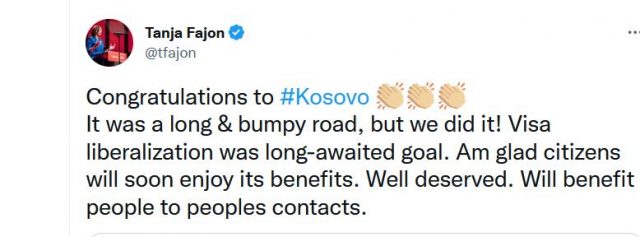 “Urime për Kosovën. Ishte një rrugë e gjatë, por ne ia dolëm! Liberalizimi i vizave ishte qëllimi i shumëpritur. Jam i kënaqur që qytetarët së shpejti do të gëzojnë përfitimet e saj. E merituar. Do të përfitojnë njerëzit për kontaktet e njerëzve”, ka shkruar ajo në Twitter.