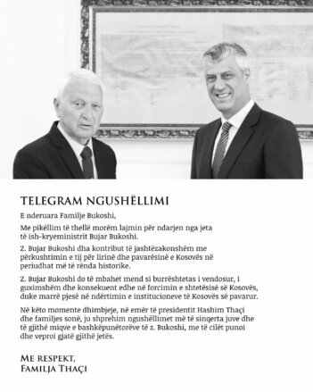 Familja e ish-presidentit të Kosovës, Hashim Thaçi, ka shprehur ngushëllime për ndarjen nga jeta të Bujar Bukoshit, ish-kryeministër i Qeverisë së Kosovës në ekzil dhe një nga figurat kyçe të lëvizjes për pavarësinë e Kosovës.