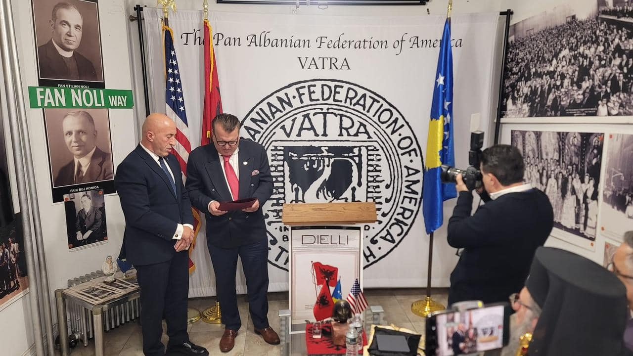 Pritja nga vëllezërit dhe motrat shqiptare në selinë e Federatës Pan-Shqiptare ‘VATRA’ më bën gjithmonë të ndjehem i nderuar dhe të kuptoj se sa i rëndësishëm është ky institucion për shqiptarët kudo që janë. Pata nderin që nga kryetari Elmi Berisha të pranoj titullin “Anëtar Nderi” i përjetshëm i Federatës Vatra.