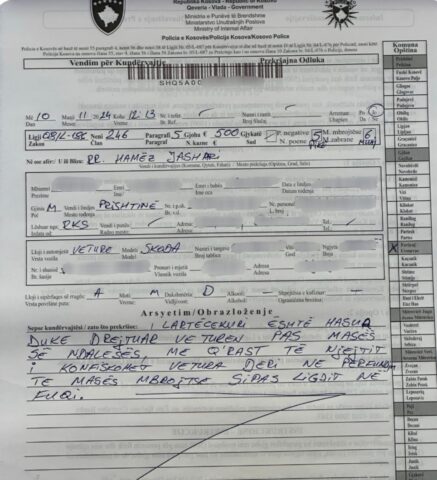 Ndaj shoferit policia i ka shqiptuar një gjobë kundërvajtëse prej 500 euro, pesë pikë negative, vazhdim i masës mbrojtëse edhe për gjashtë muaj, si dhe i është konfiskuar përkohësisht automjeti.