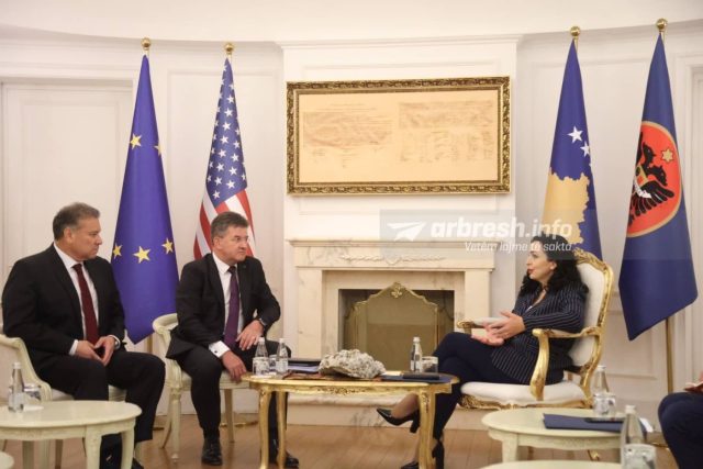 Presidentja e Kosovës, Vjosa Osmani, ka pritur në takim të dërguarin e posaçëm për Ballkanin Perëndimor të SHBA-së, Gabriel Escobar dhe ndërmjetësin e dialogut Kosovë-Serbi, Miroslav Lajçak.