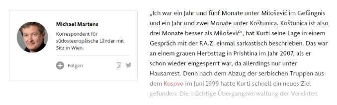 F.A.Z risjellë në vëmendje mandatin e parë të Kurtit në këtë pozotë por që përfundoi shpejt për shkak të mospajtimeve mbi menaxhimin e pandemisë, ndonëse në fakt, shpjegon gazetari Martinez, Kurti u rrëzua si pasojë e intrigave të Richard Grenellit, të dërguarit amerikan për Ballkan të presidentit të atëhershëm Donald Trump.