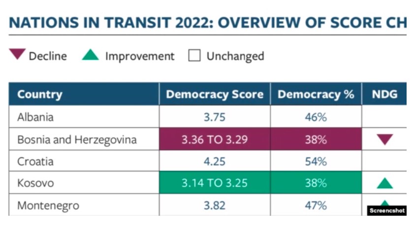 Nga vendet e rajonit gjendja është përkeqësuar në Serbi dhe në Bosnjë e Hercegovinë, ndërsa në Malin e Zi dhe Maqedoninë e Veriut, situata është e pandryshuar në krahasim me vitin e kaluar. /VOA/