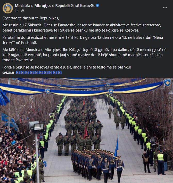 “Me këtë rast, Ministria e Mbrojtjes dhe FSK, ju ftojmë të gjithëve pa dallim, që të merrni pjesë në këtë ngjarje të veçantë, ku prania juaj sa më masive do të bëjë shumë më madhështore Festën tonë të Pavarësisë. Forca e Sigurisë së Kosovës është e juaja, andaj ejani të festojmë së bashku”, njofton Ministria e Mbrojtjes./arbresh.info/