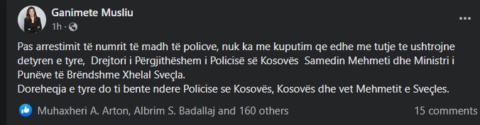 “Pas arrestimit të numrit të madh të policëve, nuk ka me kuptim qe edhe me tutje te ushtrojne detyren e tyre, Drejtori i Përgjithëshem i Policisë së Kosovës Samedin Mehmeti dhe Ministri i Punëve të Brëndshme Xhelal Sveçla”, shkroi Musliu në Facebook.