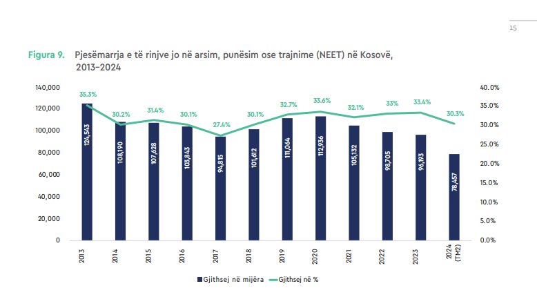 Në raport vlerësohet ‘‘karakteristikë shqetësuese’’ statistika që rreth 30% e personave të moshës 15 deri në 24 vjeç në Kosovë nuk janë në arsim, punësim ose trajnim
