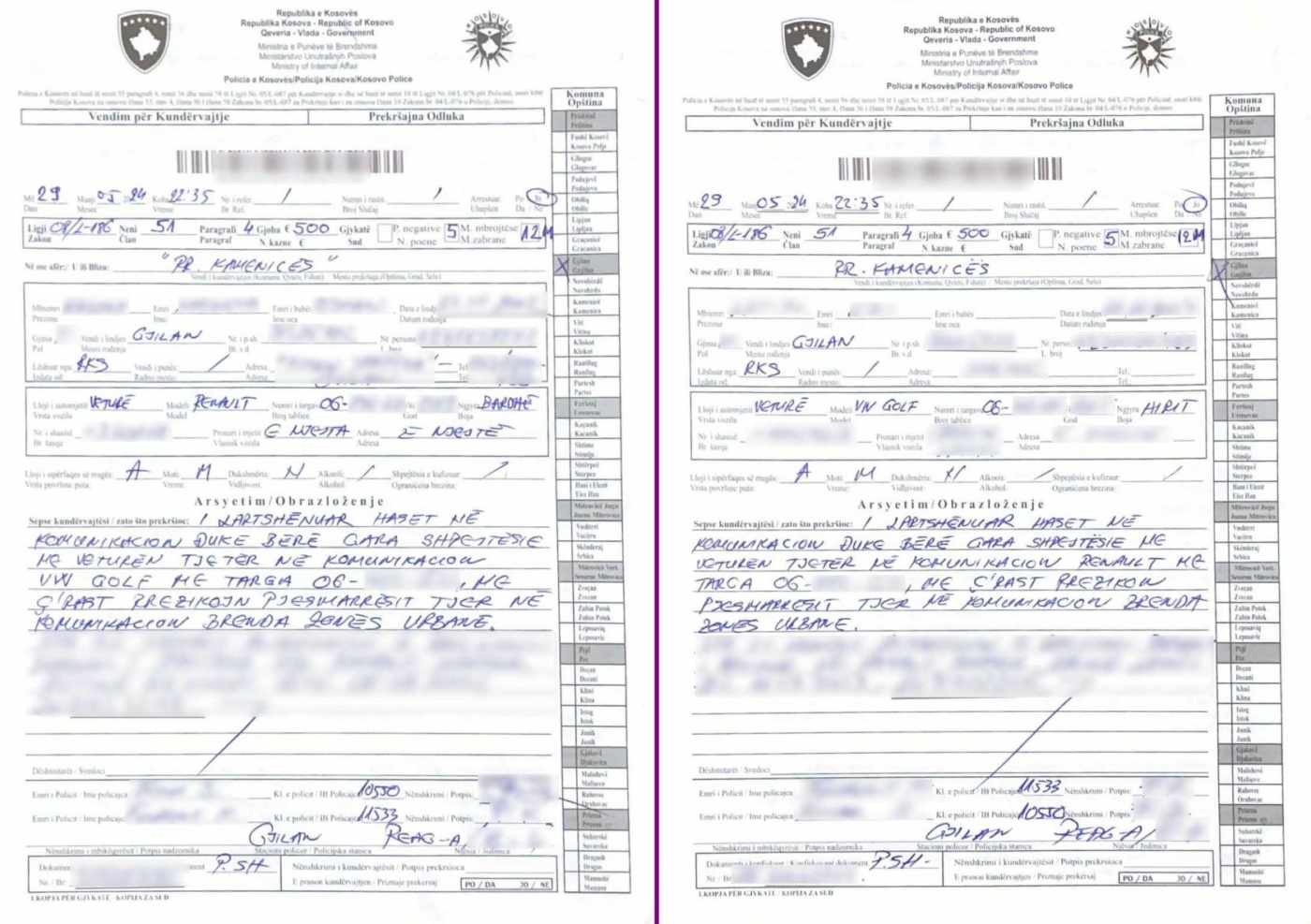 “Ndaj që të dy kundërvajtësve veç e veç janë shqiptuar gjoba në vlerë prej pesëqind (500) euro, pesë (5) pikë negative si dhe masa mbrojtëse e ndalim vozitjes së automjeteve me veprim motorik në kohëzgjatje prej dymbëdhjetë (12) muajsh”, thuhet në njoftim./Arbresh.info