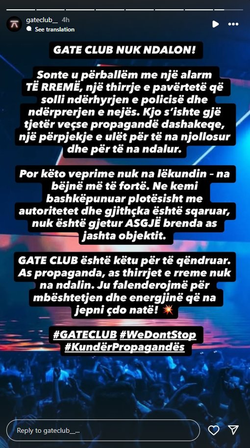 Përmes një postimi në Instagram, drejtuesit e “Gate” thanë se u përballën me një situatë të pavërtetë, e cila solli ndërhyrjen e policisë dhe ndërprerjen e festës.