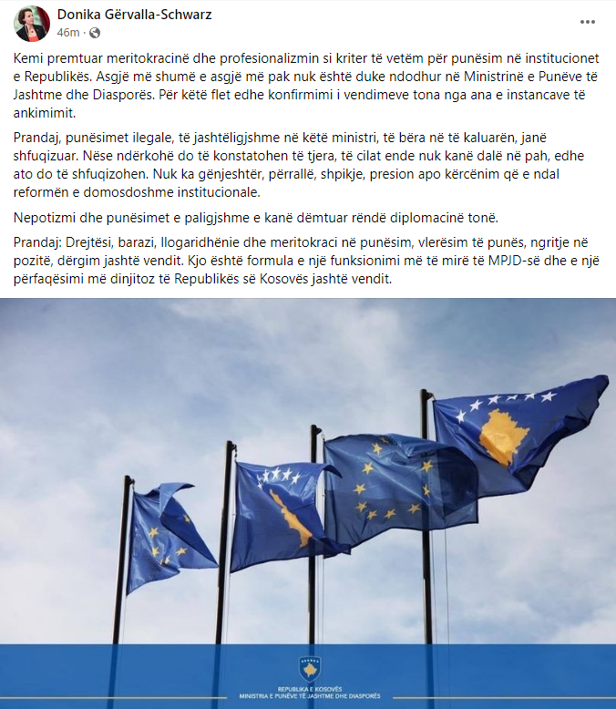 Gërvalla, përmes një shkrimi në Facebook, ka thënë se ka premtuar meritokracinë dhe profesionalizmin si kriter të vetëm për punësim në institucionet e Republikës, dhe këtë gjë po e bën si ministre.