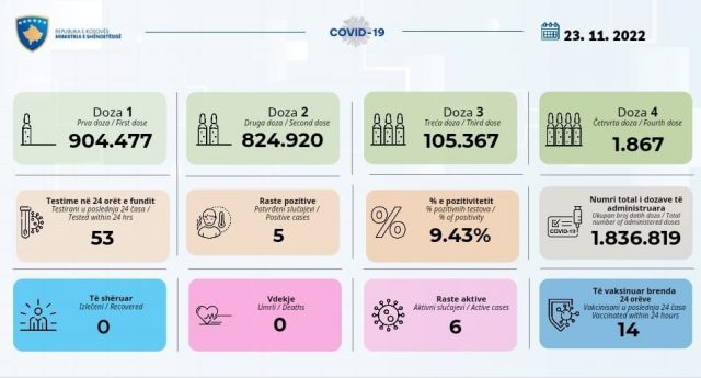 Sipas njoftimit të ministrisë së Shëndetësisë, nga 53 testime të cilat janë bërë gjatë 24 orëve të fundit, 5 prej tyre kanë rezultuar pozitiv me COVID-19.