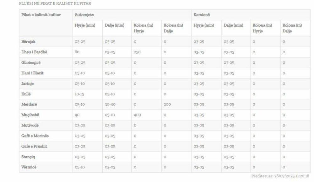 Ndërkohë, në pikën kufitare të Muçibabës, pritjet arrijnë deri në 40 minuta.