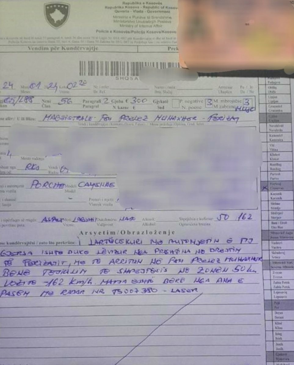 Policët e Njësisë së Komunikacionit Rrugor, me datën 24.01.2024 rreth orës 02:20 në rrugën magjistrale Ferizaj-Prishtinë, saktësisht në fshatin Prelez i Muhaxherëve të Ferizajt kanë ndaluar shoferin A.B (M/K) i moshës 28 vjeçar, i cili me veturë ka bërë tejkalimin e shpejtësisë, ku në zonën e kufizimit 50 km/h ka zhvilluar shpejtësi 162 km/h.