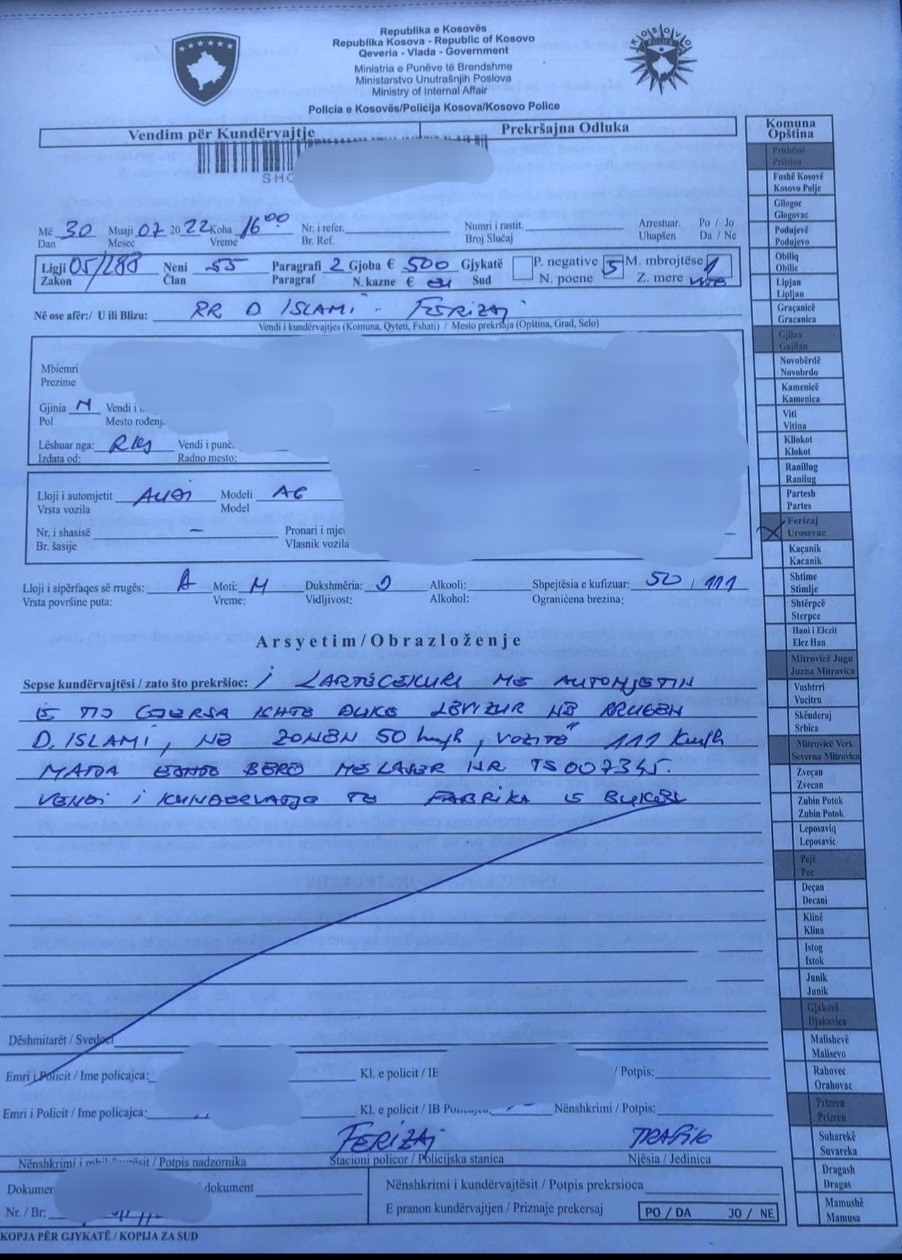 Në lidhje me këtë policia, ndaj shoferit me inicialet Q.J (M/K) i moshës 23 vjeçar i shqiptoi një gjobë, sipas ligjit të komunikacionit rrugor, 500 euro , 5 pikë negative dhe një (1) vit masë mbrojtëse ( heqje e patentë shoferit). Ai në tërësi e pranoi kundërvatjen e shkaktuar.
