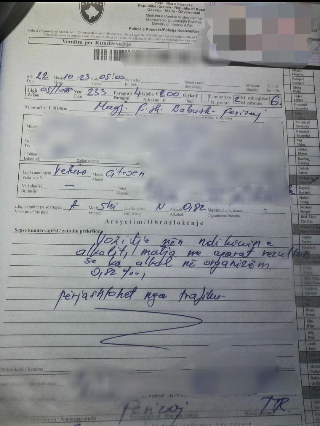 Ndaj Sh.B., 40-vjeçar dhe G.Sh., 37-vjeçar policia u ka shqiptuarnga një gjobë për kundërvajtje 200 euro, dy pikë negative dhe gjashtë muaj masë mbrojtëse, heqje e patentë shoferit, shkruan Arbresh.info