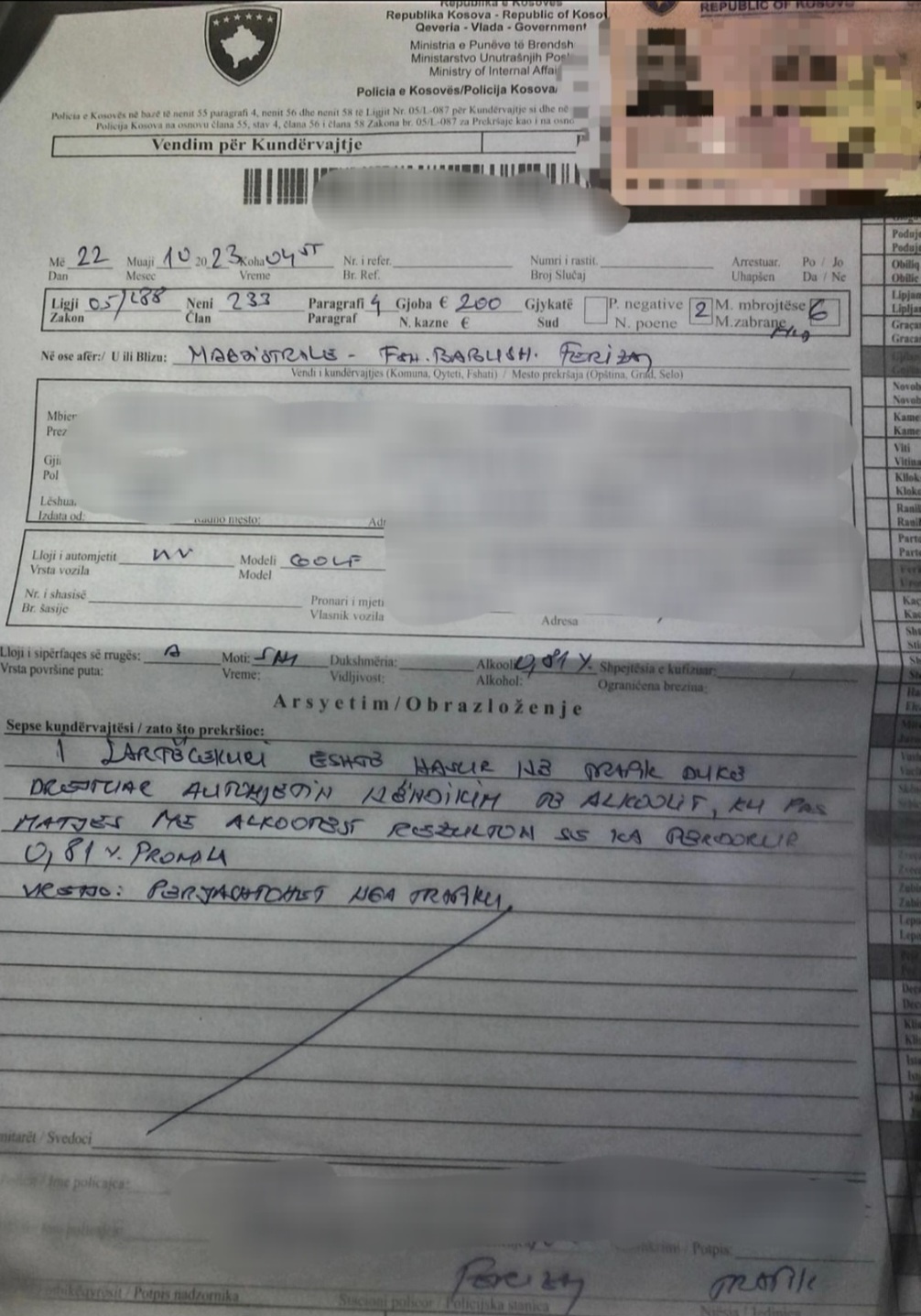 Ndaj Sh.B., 40-vjeçar dhe G.Sh., 37-vjeçar policia u ka shqiptuarnga një gjobë për kundërvajtje 200 euro, dy pikë negative dhe gjashtë muaj masë mbrojtëse, heqje e patentë shoferit, shkruan Arbresh.info