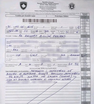 Në njoftim thuhet se shoferi me inicialet K.S. po drejtonte një veturë VË Golf me targa vendore dhe në një zonë me kufizim shpejtësie prej 40 km/h, ka lëvizur me 92 km/h, transmeton Arbresh.info.