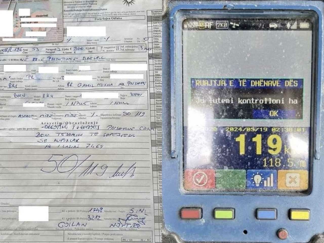 Në njoftim thuhet se kundërvajtësi voziti me shpejtësi 119 km/h në zonën ku kufizimi i shpejtësisë është 50 km/h