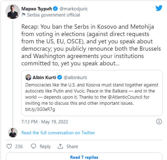 Kurti në Këshillin e Atlantikut tha se “Demokracitë si SHBA dhe Kosova duhet të qëndrojnë së bashku kundër autokratëve si Putin dhe Vuçiç. Paqja në Ballkan – dhe në botë – varet prej saj”, e për këtë Gjuriq ia ka përmendur Kurtit ndalimin e mbajtjes së zgjedhjeve serbe në Kosovë.