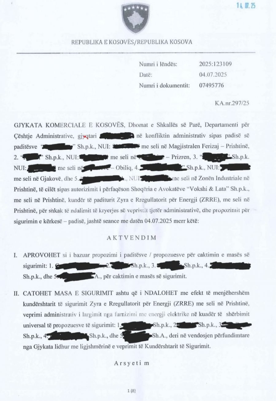 Gjykata Komerciale ka marrë aktvendimin për pezullimin e vendimit të Zyrës së Rregullatorit për Energji (ZRRE) për pesë kompani të tjera për dalje në tregun e lirë të energjisë elektrike.