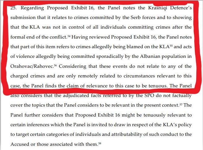 “Lidhur me Provën e Propozuar 16, Paneli vëren parashtrimin e Mbrojtjes së Krasniqit se ajo lidhet me krimet e kryera nga forcat serbe dhe me faktin se UÇK-ja nuk kishte nën kontroll të gjithë individët që kryenin krime pas përfundimit formal të konfliktit. Pasi shqyrtoi Provën e Propozuar 16, Paneli vëren se një pjesë e kësaj pike i referohet krimeve që dyshohet se i janë fajësuar UÇK-së dhe akteve të dhunës që dyshohet se janë kryer në mënyrë sporadike nga popullsia shqiptare në Rahovec. Duke marrë parasysh se këto ngjarje nuk lidhen me asnjë nga krimet e akuzuara dhe lidhen vetëm në distancë me rrethanat relevante për këtë çështje, Paneli e gjen pretendimin e rëndësisë për këtë çështje të dobët. 5Paneli gjithashtu konsideron se Prova e Propozuar 16 mund të jetë paksa relevante për disa përfundime që Paneli ftohet të nxjerrë në lidhje me politikën e UÇK-së për të synuar kategori të caktuara individësh dhe atribuimin e një sjelljeje të tillë të Akuzuarve ose atyre që lidhen me ta”, thuhet në vendim.