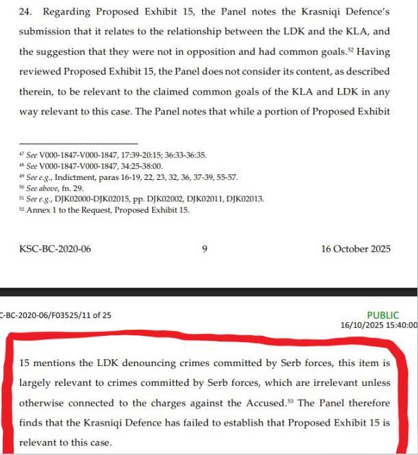 “Lidhur me Provën e Propozuar 15, Trupi Gjykues vëren parashtrimin e Mbrojtjes së Krasniqit se ajo lidhet me marrëdhënien midis LDK-së dhe UÇK-së, dhe sugjerimin se ato nuk ishin opozitë dhe kishin qëllime të përbashkëta. Pasi shqyrtoi Provën e Propozuar 15, Trupi Gjykues nuk e konsideron përmbajtjen e saj, siç përshkruhet aty, të jetë relevante për qëllimet e përbashkëta të pretenduara të UÇK-së dhe LDK-së në asnjë mënyrë relevante për këtë çështje. Trupi Gjykues vëren se, ndërsa një pjesë e Provës së Propozuar 15 përmend denoncimin e LDK-së për krimet e kryera nga forcat serbe, kjo pikë është kryesisht relevante për krimet e kryera nga forcat serbe, të cilat janë të parëndësishme përveç nëse lidhen ndryshe me akuzat kundër të Akuzuarit. Prandaj, Trupi Gjykues konstaton se Mbrojtja e Krasniqit nuk ka arritur të vërtetojë se Prova e Propozuar 15 është relevante për këtë çështje”, thuhet më tutje në këtë vendim, raporton Nacionale.
