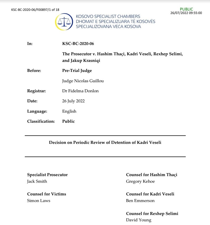 Dhomat e Specializuara të Hagës ia kanë vazhduar paraburgimin ish-kryetarit të Kuvendit të Kosovës, Kadri Veseli.