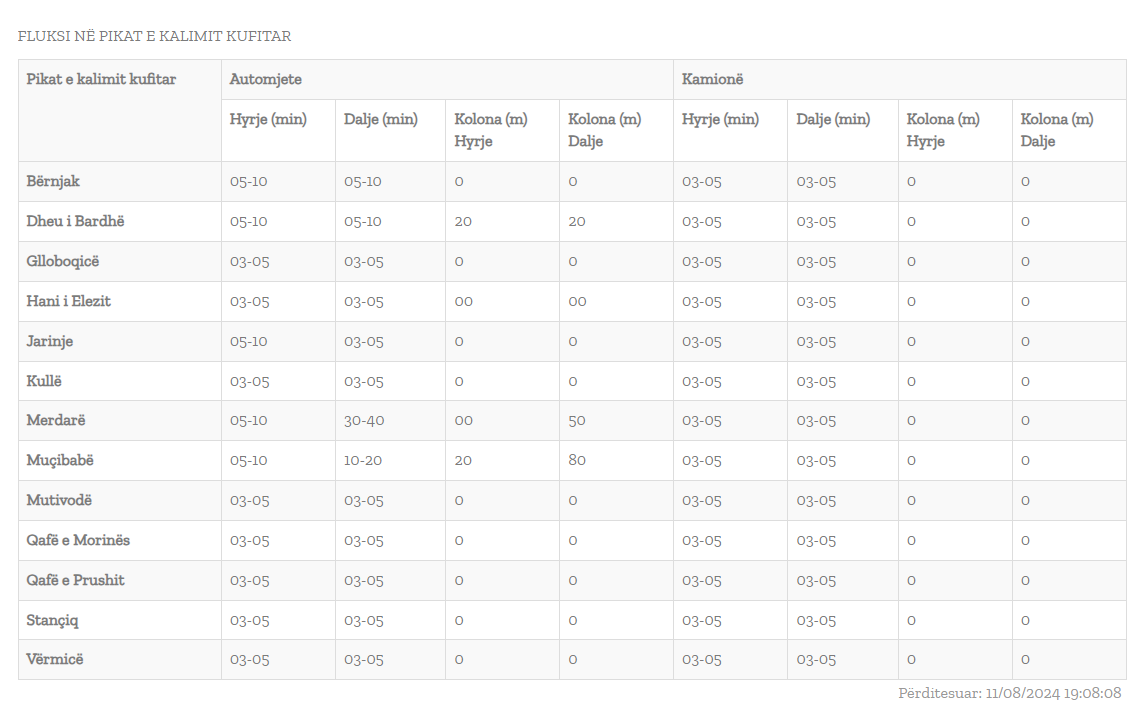 Në pikat e kalimit kufitar me Serbinë si Bërnjak, Dheu i Bardhë, Hani i Elezit, dhe Jarinje, pritjet për hyrje dhe dalje janë midis 3 dhe 10 minutave, ndërsa në pikën kufitare të Merdarit, për të lënë Kosovën nevojiten rreth 30-40 minuta./Arbresh.info/