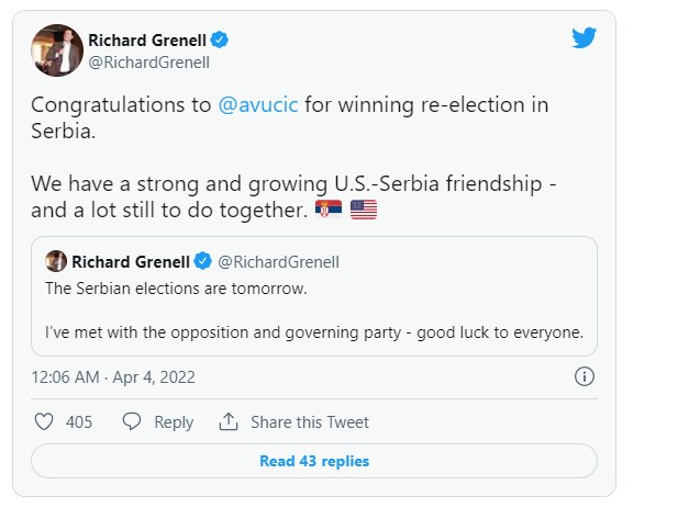 Ish-i dërguari i Shteteve të Bashkuara të Amerikës për dialogun ndërmjet Serbisë dhe Kosovës, Richard Grenell, ia ka uruar fitoren në zgjedhje Aleksandar Vuçiqit.