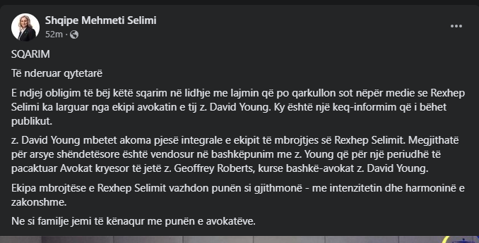 Ajo në një postim në Facebook ka thënë se nuk qëndron fakti se Rexhep Selimi ka larguar avokatin Young, por e vërteta është se ai ka kërkuar që për arsye shëndetësore, kryeavokat të jetë Geoggrey Roberts, kurse avokat të jetë David Young.
