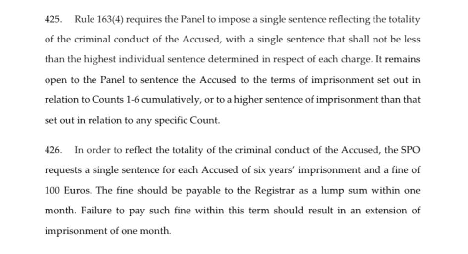 Për të pasqyruar të gjithë sjelljen kriminale të të akuzuarit, Prokuroria e Specializuar kërkon një dënim të vetëm për secilin të akuzuar nga gjashtë vjet burg dhe 100 euro gjobë. Mospagesa e gjobës në afatin e caktuar, duhet të rezultojë me një zgjatje të dënimit me burgim për një muaj, thuhet në përmbledhjen e fundit prej 156 faqesh të prokurorisë.