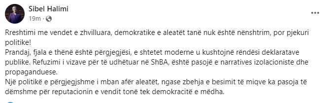 “Rreshtimi me vendet e zhvilluara, demokratike e aleatët tanë nuk është nënshtrim, por pjekuri politike. Prandaj, fjala e thënë është përgjegjësi, e shtetet moderne u kushtojnë rëndësi deklaratave publike. Refuzimi i vizave për të udhëtuar në ShBA, është pasojë e narratives izolacioniste dhe propaganduese. Një politikë e përgjegjshme i mban afër aleatët, ngase zbehja e besimit të miqve ka pasoja të dëmshme për reputacionin e vendit tonë tek demokracitë e mëdha”, ka thënë Halimi./arbresh.info/