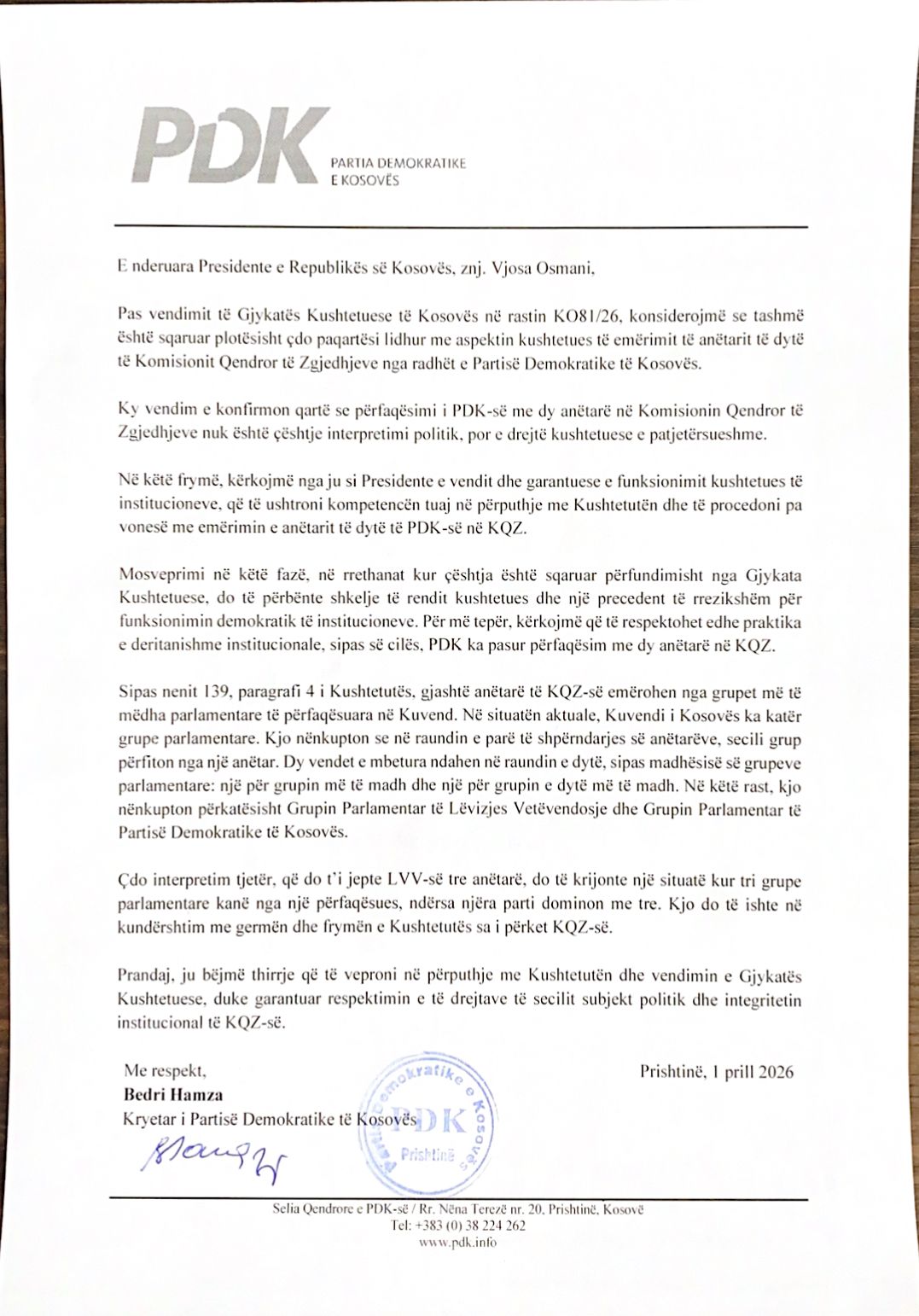 Përmes kësaj letre, Hamza ka theksuar se vendimi i Gjykatës Kushtetuese të Kosovës në rastin KO81/26 ka sqaruar përfundimisht çdo paqartësi lidhur me këtë çështje, duke konfirmuar se përfaqësimi i PDK-së me dy anëtarë në KQZ është një e drejtë kushtetuese dhe jo çështje interpretimi politik.