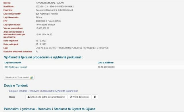 Në njoftimin e Komisionit Rregullativ të Prokurimit Publik (KRPP), afati për aplikim në këtë tender mbyllet më 16 janar të vitit të ardhshëm. Vlera e parashikuar e këtij projekti është 15 milionë euro dhe është bashkëfinancim midis komunës dhe Ministrisë së Kulturës.