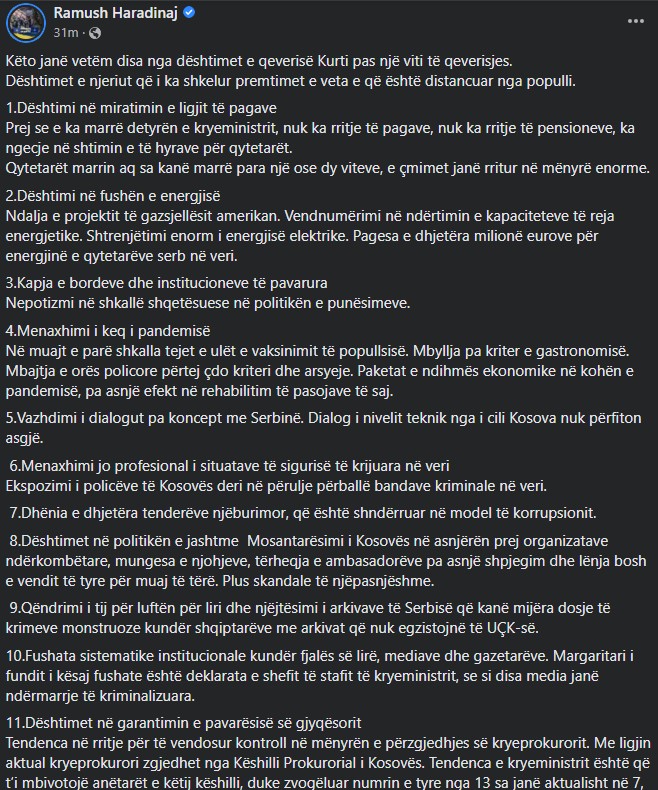 “Kërkesa qesharake e Kurtit në Bruksel për shndërrimin e CEFTA-s në SEFTA. Deklarimi pa sqarim se Kosova e mbështet një Asociacion gjeografik. Qëndrimi skandaloz që Marrëveshja e Uashingtonit nuk ka obligime juridike për Kosovën. Shfuqizimi i marrëveshjeve me komuna dhe heqja e mjeteve të parapara me buxhet. Zvogëlimi i subvencioneve për bujq, vonesa e realizimit të tyre dhe realizimi parcial. Zvogëlimi i subvencioneve direkte për vreshtarë prej 1000 në 400 euro. Heqja dorë nga rivendosja e reciprocitetit me Serbinë pavarësisht se ishte premtim elektoral i VV. Nisma e pastudiuar për padi ndaj Serbisë për gjenocid qe mund te na kthehet në humbje…..”, ka shkruar Haradinaj./arbresh.info/