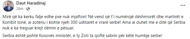 “Mirë që ka kërkuar falje edhe pse nuk mjafton! Në vend që t’i numëroj dëshmorët dhe martirët e Kombit tonë, ai zotëriu i kishte njeh 300 ushtarët e vrarë serbë! Ama ai duhet me e ditë që Serbia nuk e ka treguar krejt dëmin e pësuar”, ka shkruar Haradinaj.