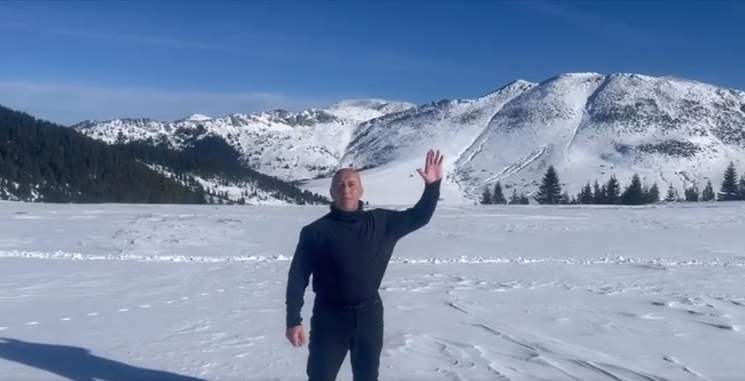 Përmes një video të publikuar në llogarinë e tij në Facebook, Haradinaj dëgjohet duke thënë “të fala prej Shtedimit sot, këqyrni sa bukur”, teksa shihen pas tij malet e mbuluara me borë.