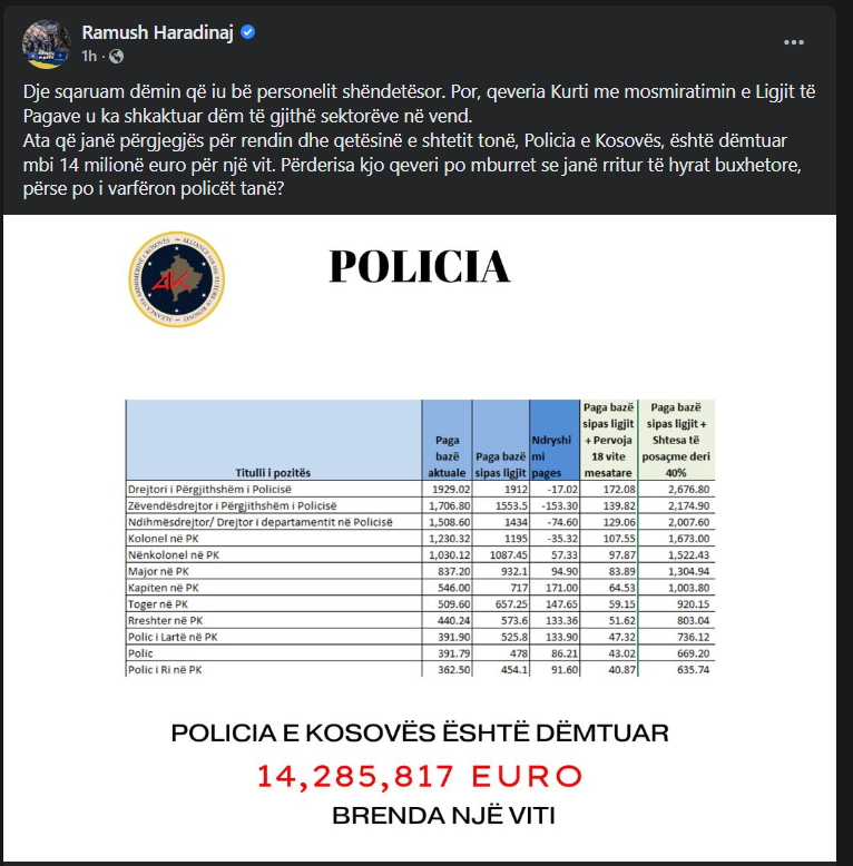 Sipas tij, ata që janë përgjegjës për rendin dhe qetësinë e shtetit tonë, Policia e Kosovës, është dëmtuar mbi 14 milionë euro për një vit, duke shtruar pyetjen se përderisa kjo qeveri po mburret se janë rritur të hyrat buxhetore, përse po i varfëron policët tanë?