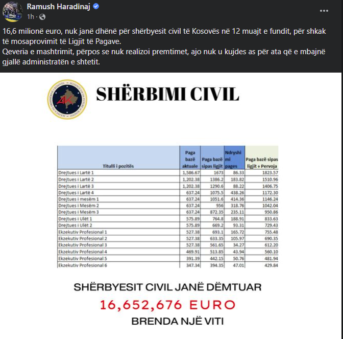 Kryetari i AAK-së, Ramush Haradinaj thotë se për shkak të mosaprovimit të Ligjit të Pagave, nuk janë dhënë 16,6 milionë euro për shërbyesit civil të Kosovës në 12 muajt e fundit.