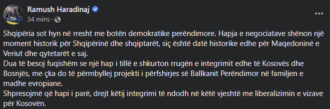 “Shqipëria sot hyn në rresht me botën demokratike perëndimore. Hapja e negociatave shënon një moment historik për Shqipërinë dhe shqiptarët, siç është datë historike edhe për Maqedoninë e Veriut dhe qytetarët e saj. Dua të besoj fuqishëm se një hap i tillë e shkurton rrugën e integrimit edhe të Kosovës dhe Bosnjës, me çka do të përmbyllej projekti i përfshirjes së Ballkanit Perëndimor në familjen e madhe evropiane. Shpresojmë që hapi i parë, drejt këtij integrimi të ndodh në këtë vjeshtë me liberalizimin e vizave për Kosovën”, shkroi Haradinaj në facebook. /arbresh.info/