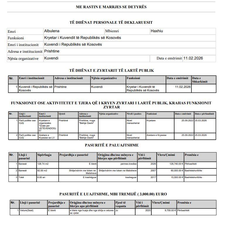 Ushtruesja e detyrës së Presidentes dhe njëherësh Kryeparlamentarja, Albulena Haxhiu, ka deklaruar blerjen e një banese gjatë këtij viti, sipas formularit të publikuar nga Agjencia për Parandalimin e Korrupsionit.