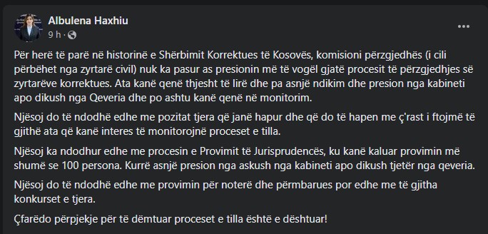 Haxhiu përmes një postimi në Facebook, ka shkruar se “për herë të parë në historinë e Shërbimit Korrektues të Kosovës, komisioni përzgjedhës (i cili përbëhet nga zyrtarë civil) nuk ka pasur as presionin më të vogël gjatë procesit të përzgjedhjes së zyrtarëve korrektues”.
