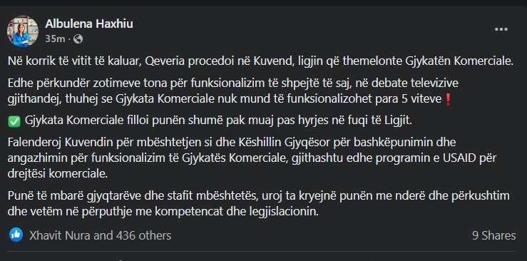 “Në korrik të vitit të kaluar, Qeveria procedoi në Kuvend, ligjin që themelonte Gjykatën Komerciale. Edhe përkundër zotimeve tona për funksionalizim të shpejtë të saj, në debate televizive gjithandej, thuhej se Gjykata Komerciale nuk mund të funksionalizohet para 5 viteve! Gjykata Komerciale filloi punën shumë pak muaj pas hyrjes në fuqi të Ligjit”, ka thënë Haxhiu përmes një statusi në Facebook.