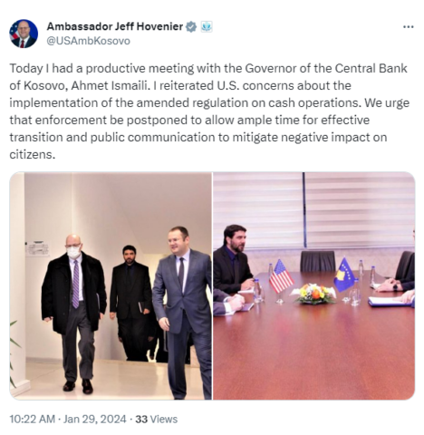 “Pata një takim produktiv me Guvernatorin e Bankës Qendrore të Kosovës, Ahmet Ismaili. Përsërita shqetësimet e SHBA-ve për zbatimin e rregullores së ndryshuar për operacionet me para. Ne kërkojmë që zbatimi të shtyhet për të lënë kohë të mjaftueshme për tranzicion efektiv dhe komunikim publik për të zbutur ndikimin negativ tek qytetarët”, ka shkruar ai në X./Arbresh.info/