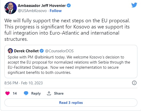 “Ne do të mbështesim plotësisht hapat e ardhshëm për propozimin e BE-së. Ky progres është i rëndësishëm për Kosovën pasi ne mbështesim integrimin e saj të plotë në strukturat euroatlantike dhe ndërkombëtare”, shkroi Hovenier në Twitter.