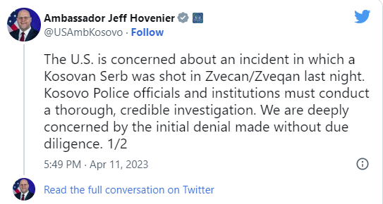 “SHBA-të janë të shqetësuara për një incident në të cilin një serb i Kosovës u qëllua mbrëmë në Zveçan/Zveqan. Zyrtarët dhe institucionet e Policisë së Kosovës duhet të kryejnë një hetim të plotë dhe të besueshëm. Ne jemi thellësisht të shqetësuar nga mohimi fillestar i bërë pa kujdesin e duhur”.