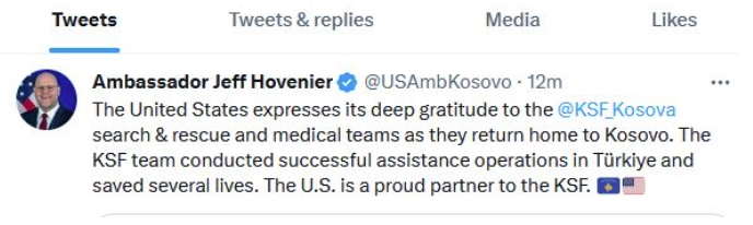 “Shtetet e Bashkuara shprehin mirënjohjen e tyre të thellë për FSK-në, ekipet e kërkim-shpëtimit dhe ekipet mjekësore ndërsa kthehen në shtëpi në Kosovë. Ekipi i FSK-së kreu operacione të suksesshme të ndihmës në Turqi dhe shpëtoi disa jetë. SHBA-të janë krenar për parneritetin me FSK-në”, ka shkruar ai në Twitter.