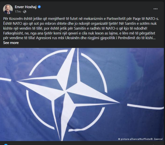 “Fatkeqësisht, ne, nga ana tjetër kemi një qeveri e cila nuk lexon as lajme, e lëre më të përgatitet për vendime të tilla! Agresioni rus mbi Ukrainën dhe rizgjimi gjepolitik i Perëndimit do të kishin kuptim vetëm duke u mbështetur anëtarësimi i Kosovës dhe Bosnjës në NATO, duke i ofruar Ballkanit paqen e përhershme, ka shkruar Hoxhaj./arbresh.info/