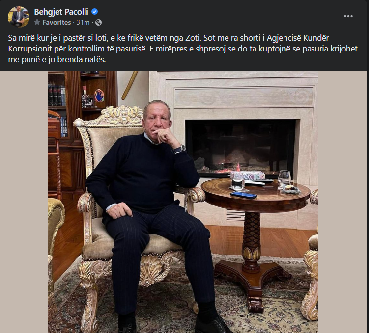 “Sa mirë kur je i pastër si loti, e ke frikë vetëm nga Zoti. Sot me ra shorti i Agjencisë Kundër Korrupsionit për kontrollim të pasurisë. E mirëpres e shpresoj se do ta kuptojnë se pasuria krijohet me punë e jo brenda natës”, shkruan Pacolli në Facebook./arbresh.info/